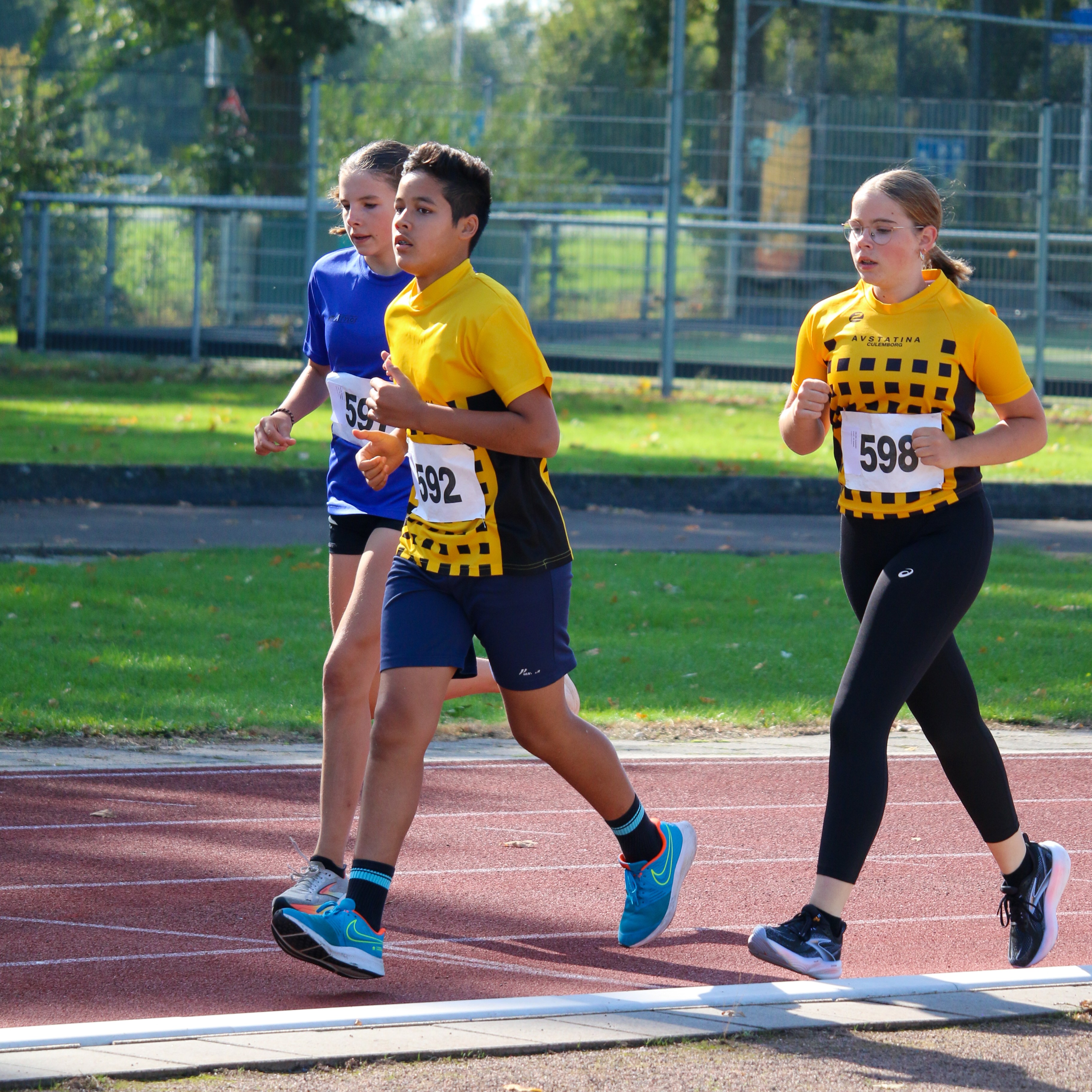 Het enige ‘losse’ nummer was de 3000 meter. Verspreid over de baan liepen allemaal koppels. Twee atleten werden ‘gehaast’ om een goede tijd neer te zetten en Dagmar Kolthof en Yente Koerting liepen de hele 3000 meter samen op en hadden veel steun aan elkaar. Yente wist met haar soepele tred nog een mooie eindsprint te plaatsen en kwam nét voor Dagmar in een knappe tijd van 13.30 minuten over de finish.
